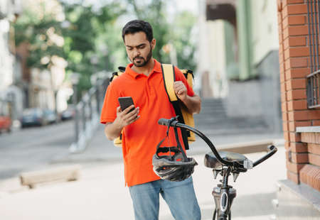 Serious young man with beard in uniform with yellow backpack looks at smartphone, standing near a bicycle with helmet on street, free space