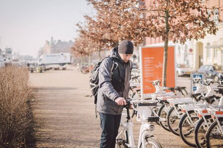 man rents electric white bicycle in Copenhagen. E-Bicycle Rental Station. Male parked city bikes for rent, saying Save CO2 and Green energy. Young man depositing his cycle. Public bikes for rent.
