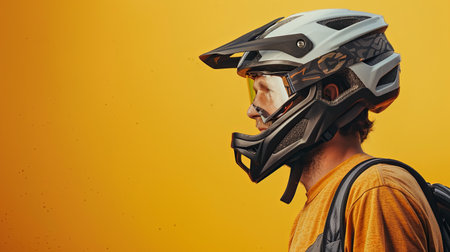 A close-up side view of a man wearing a helmet and goggles, holding the handlebars of his mountain bike, against a yellow background.