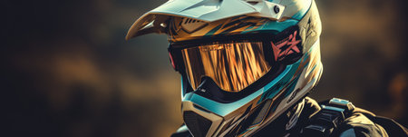 Close-up portrait of a motocross rider on sunset background