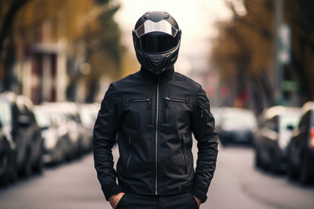serious man wearing motorcycle gear and helmet, black colors, AI Generated