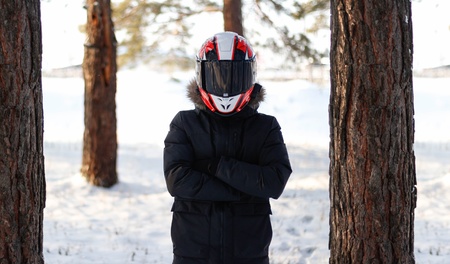 Motorcyclist in a warm winter jacket in the winter forest.