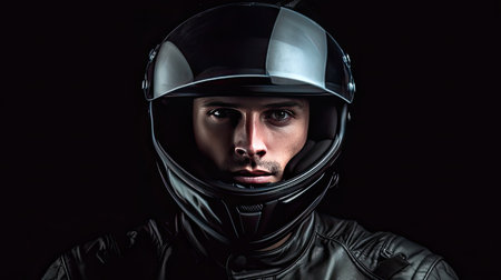 Portrait of a racer wearing a helmet on a dark background.