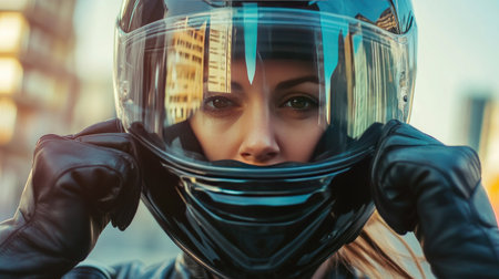 A striking portrait of a confident female motorcyclist adjusting her helmet, embodying the spirit of adventure in an urban setting. The vibrant environment enhances the sense of freedom.