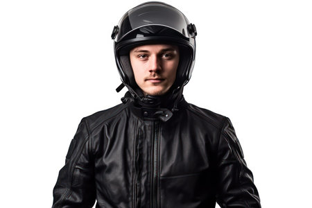 portrait of a motorcycle rider posing with a black helmet on a white background