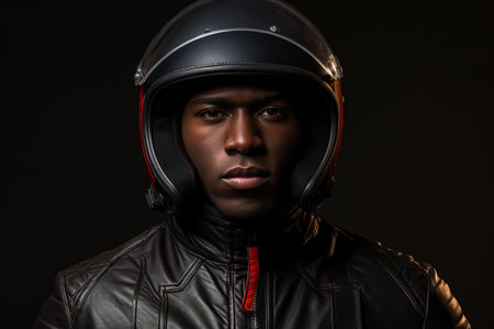 Black motorcyclist with helmet depicted in portrait