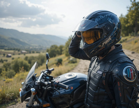 Biker in black helmet and leather jacket stands beside motorcycle on sunlit road at golden hour, enjoying a summer sunset ride and the freedom of open-road adventure