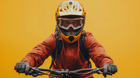 A close-up of a mountain biker wearing a helmet and goggles, riding on a yellow background.
