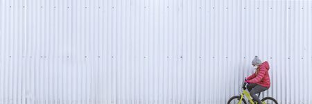 Girl in protective mask and pink jacket riding bike during quarantine. New normal life city. Little lady enjoying bike ride on her way to school or park. Sport for kids and eco transport concept.