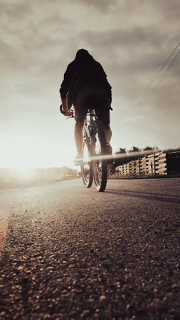 Low-angle view of a cyclist riding along a country road at sunset. Concept of freedom, adventure, healthy lifestyle, outdoor sports, and evening cycling.