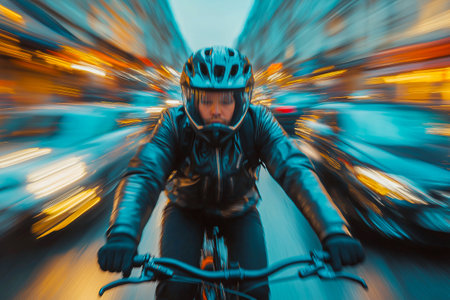 Healthy athletes cycling in blurred motion through city traffic at night generated by artificial intelligence