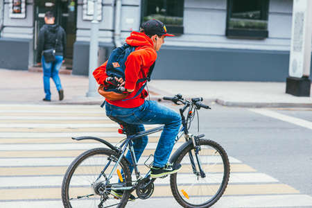 Moscow, Russia - JULY 7, 2017: A young man in a red hoodie crosses a pedestrian crossing on a Bicycle without hands