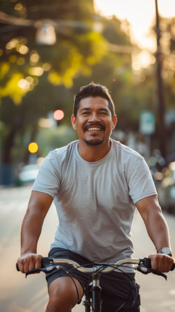 This image shows a man riding a bicycle down a city street. He is smiling and wearing a light gray t-shirt and black shorts. The sun is setting in the background, casting a warm glow over the scene.