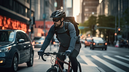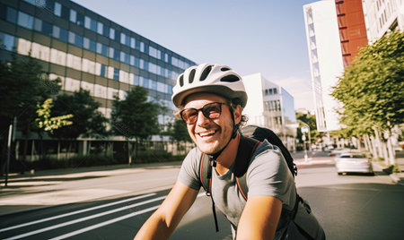 Young man bicycling to work on the streets of a modern city. Generative AI