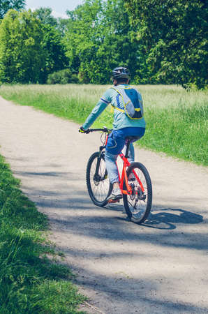lone cyclist on the road near the forest on a summer day. This is his single practice. Photo taken at t the outskirts of Moscow close to woodland Pokrovskoye-Streshnevo.
