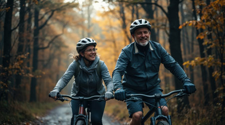Elderly couple, casually dressed, laughing while riding bicycles in a forest.