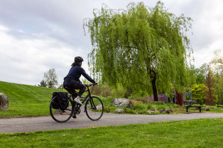 Adult Caucasian Woman Riding a Bicycle on a path in a modern city park. Spring Evening. Taken in Hawthorne Rotary Park, Surrey, Vancouver, British Columbia, Canada.