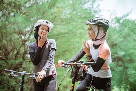 Two asian women cycling and one showing his watch during a cycling break in the park