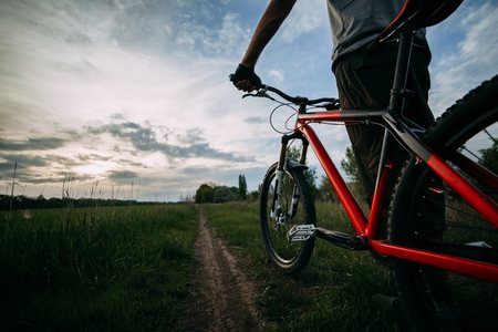 Low-angle view of a cyclist riding along a country road at sunset. Concept of freedom, adventure, healthy lifestyle, outdoor sports, and evening cycling.