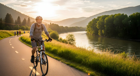 A fit senior man with a helmet and backpack smiles while riding a bicycle on a paved path next to a wide river at sunset. The background features rolling hills and trees. This image represents an active senior lifestyle, health, and exercise in nature.