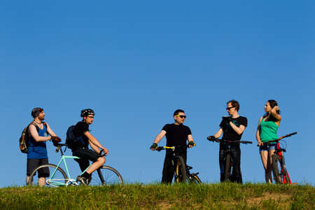 Group of cyclists holding hands together at sunset. Silhouettes of young persons with bikes standing on meadow and holding hands at evening sky.