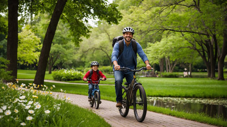 Leisurely bike ride by an older man in a park, dressed in black with a beanie, amidst green scenery. AI generative.