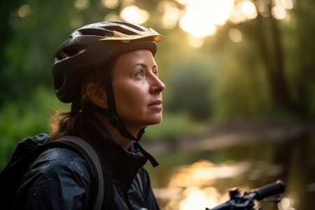 Active woman spending free summer vacation time on a bicycle trip in a forest. Woman wearing bicycle helmet and gloves holding bike with basket and drinking a water from bottle