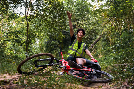 Mountain Bike Accident Cyclist Falls and Suffers Injury in Practice Activities Cycling Sports in Natural Park, Urgent Aid Required from First Aid Staff Assistant.