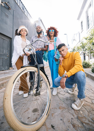 Friends group, bicycle and portrait outdoor for travel, fashion style and fun with young people in city. Diversity, gen z and men and women with cool attitude on student adventure on urban street