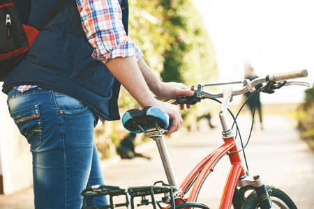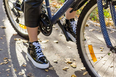 Happy young woman with bicycle relaxing in the park. Close view on legs. Autumn and sport time relax concept.