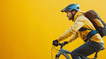 A man wearing a helmet rides a mountain bike in front of a bright yellow background.
