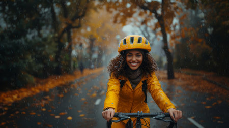Smiling young woman riding a bike in the rain, wearing a yellow jacket and helmet on an autumn day with colorful leaves in the background.