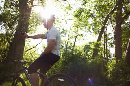 A man in a tracksuit stands next to a bicycle on a road in the forest. The concept of a healthy lifestyle, cardio training. Copyspace