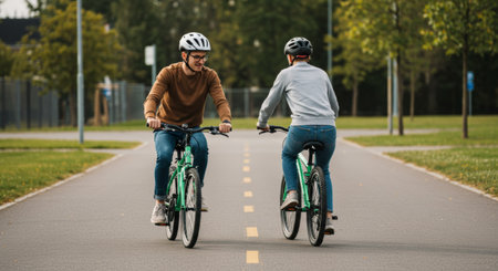 Riding bicycle in park Closeup of young woman riding bicycle in park : Generative AI