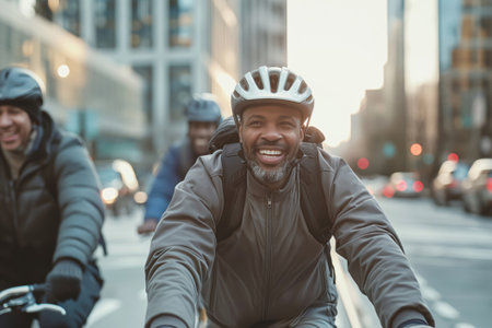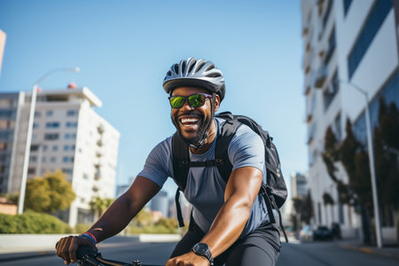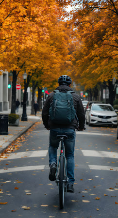 A woman with a backpack rides her bike through a sun-drenched city street, embracing an active urban lifestyle. Ai-Generated