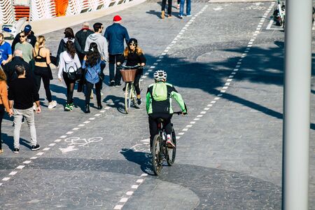 Tel Aviv Israel January 11, 2020 View of unidentified people rolling with a bicycle in the streets of Tel Aviv in winter