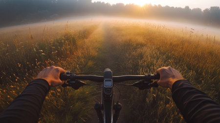 Riding a bike through a misty field at sunrise offers a serene escape into natures beauty