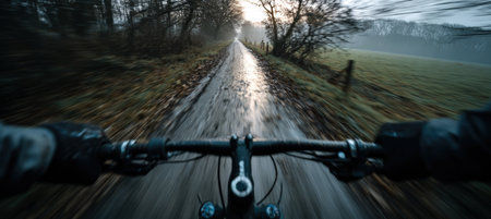 Panoramic point-of-view image of cycling through a countryside road. Handlebar and gloved hands visible, with a wet, shiny surface creating an adventurous, cinematic atmosphere.