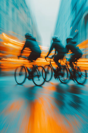 Healthy athletes cycling in blurred motion through city traffic at night generated by artificial intelligence