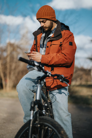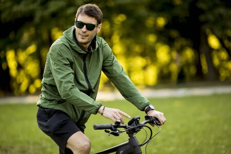 Young man with bicycle enjoying leisure time in urban park, exemplifying a healthy and active lifestyle