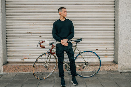 young teenage man with bicycle in the street in front of the background garage blind with space