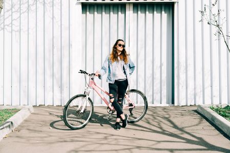 a young stylish girl holds a pink Bicycle standing next to her, against the background of a light hangar