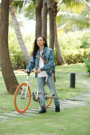 Serious young Vietnamese guy in denim wear walking with bicycle on pathway in tropical park with palms
