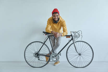 Fulllength portrait of confident african man standing in front of his bike Studio shot of emotional black guy in bright outfit posing with bicycle : Generative AI