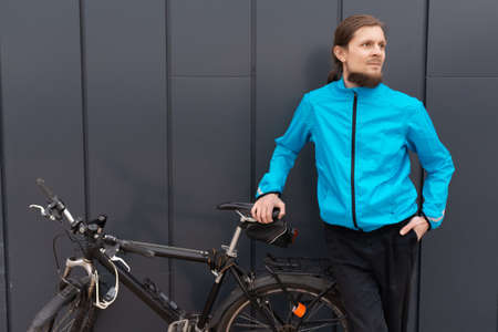 Caucasian male athlete taking break outdoors during morning cyclist. Positive young man sitting on bike and looking aside. Favorite sport hobby.