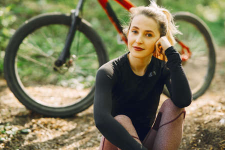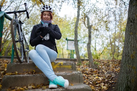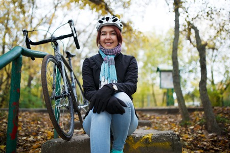 Happy young woman with bicycle relaxing in the park. Close view on legs. Autumn and sport time relax concept.