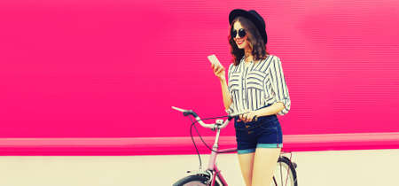 Summer portrait of happy smiling young woman with smartphone and bicycle on city street on pink background, blank copy space for advertising text