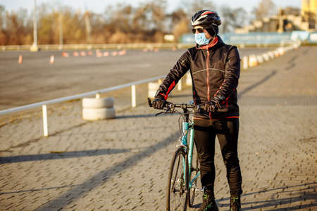 An athlete in glasses and a protective mask stands in the park on a bicycle road with a bicycle. Quarantined sports and outdoor recreation.