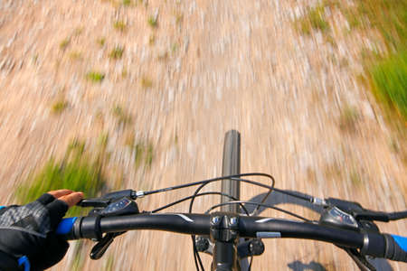Detail of a mountain bike on a dirty and gravy rural road. View from above.