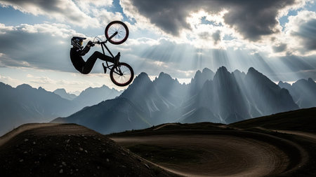 A man is riding a bike on a mountain with clouds in the background. Concept of adventure and excitement as the man is performing a stunt on his bike